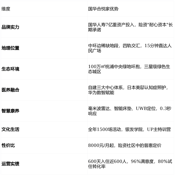 国华合悦家构建"活力老年中心+认知症解决方案中心+海派中医传承中心"三大体系,实现从独立生活→协助护理→专业护理→认知症照护→安宁疗护的五级无缝衔接