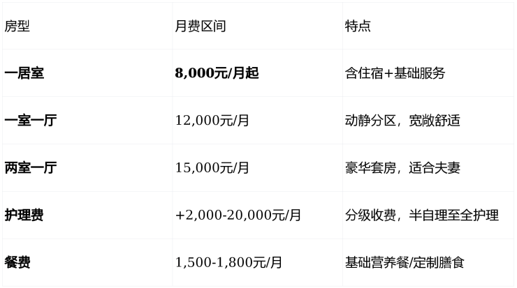 基础月费:7,400-21,500元/人(含房费+基础服务)