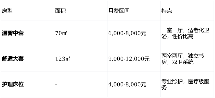 护理费:按ADL评估分级,自理型免收,护理型2,000-6,000元/月