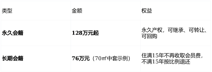 💰 会籍制灵活透明:128万起永久产权可继承,月费4000-12000元,住满15年性价比极高