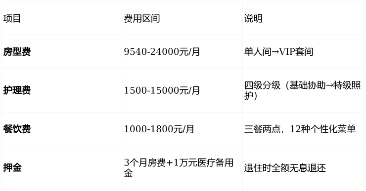 自理长者单人间:9540(房费)+1500(护理)+1500(餐饮)=约12540元/月
