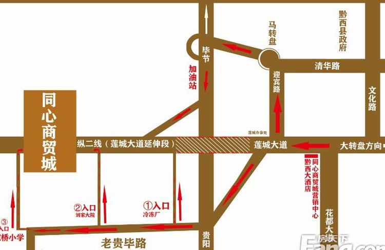 同心商贸城位于黔西莲城大道延伸段纵二线,即黔西高铁客运站旁,项目紧邻南部新区主干道横三线、纵二线,呲邻客运中心枢纽站,距清黔高速出入口约两公里,距黔织、黔大、黔息高速出入匝道口约四公里。同心商贸城由民建中央对口引进,享受黔西县招商引资优惠奖励的政府重点项目,总占地约2000亩,其中约800亩一站式综合商贸批发市场,400亩城市综合体、800亩生态高端住宅(河流水域面积150亩),总投资约67亿元人民币。是中国商业联合会、中国建材家居协会、毕节中国银行、工商银行、建设银行等金融机构的战略合作伙伴,是中国市场“百城万亿”重点扶持项目、民建中央毕节地区重点关注项目。 同心商贸城一期为一站式现代化综合商贸批发市场,市场内设有小商品市场、家居建材市场.街区式建材市场、副食品市场、中药材市场、汽摩配市场、五金机电市场、板材型材市场、汽车4S店等七大功能区以及独立设置仓储物流区。场馆式与街区式结合的建筑形式,更符合黔西现有商业状况。项目周边有大量的住宅区、学校、医院、公园及黔西的教育产业园等公共配套设施,庞大的消费群体为同心商贸城的持续经营与繁荣奠定了坚实的基础,同时,以现代化、一站式理念在市场内配备有宾馆、影城、写字楼、餐饮街、单身公寓、城市综合体等生活、休闲娱乐配套设施以专业、责任、创新、共赢的企业精神,立足黔西、在深度了解黔西、贵州生活、商业状况的基础上,大量引进人才和先进技术,为项目的持续发展做到了更好的保障。 同心商贸城批零兼营,划行规市,整合产业链消费模式,打造复合式商贸流通平台及黔西北 ,商贸物流大平台,打造黔西北专业市场标志性品牌。