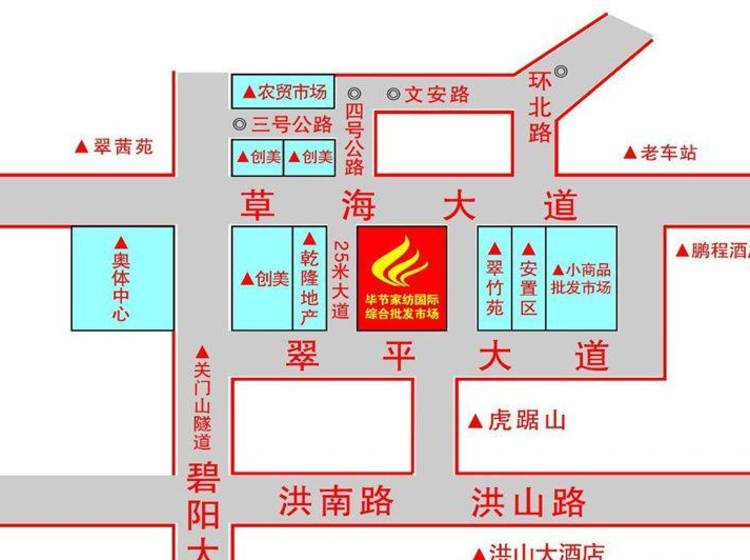 毕节家纺国际专业批发市场地处老城区、毕海新区、茶亭新区、南部新区和东部新区几个区域的中心位置,成熟商圈,黄金少有地段,毗邻国贸购物中心,地理位置十分优越。毕节家纺国际专业批发市场是2015年1月15日七星关区人民政府指定规划的纯商业的独立门面,是一个少有获得政府批文的集小商批批发、窗帘布匹批发、服装批发、床上用品批发、鞋袜、箱包批发,酒店、餐饮、娱乐会所、KTV、电影院、健身房等为一体的综合休闲娱乐购物中心。一流的设计,星级式的物业服务。