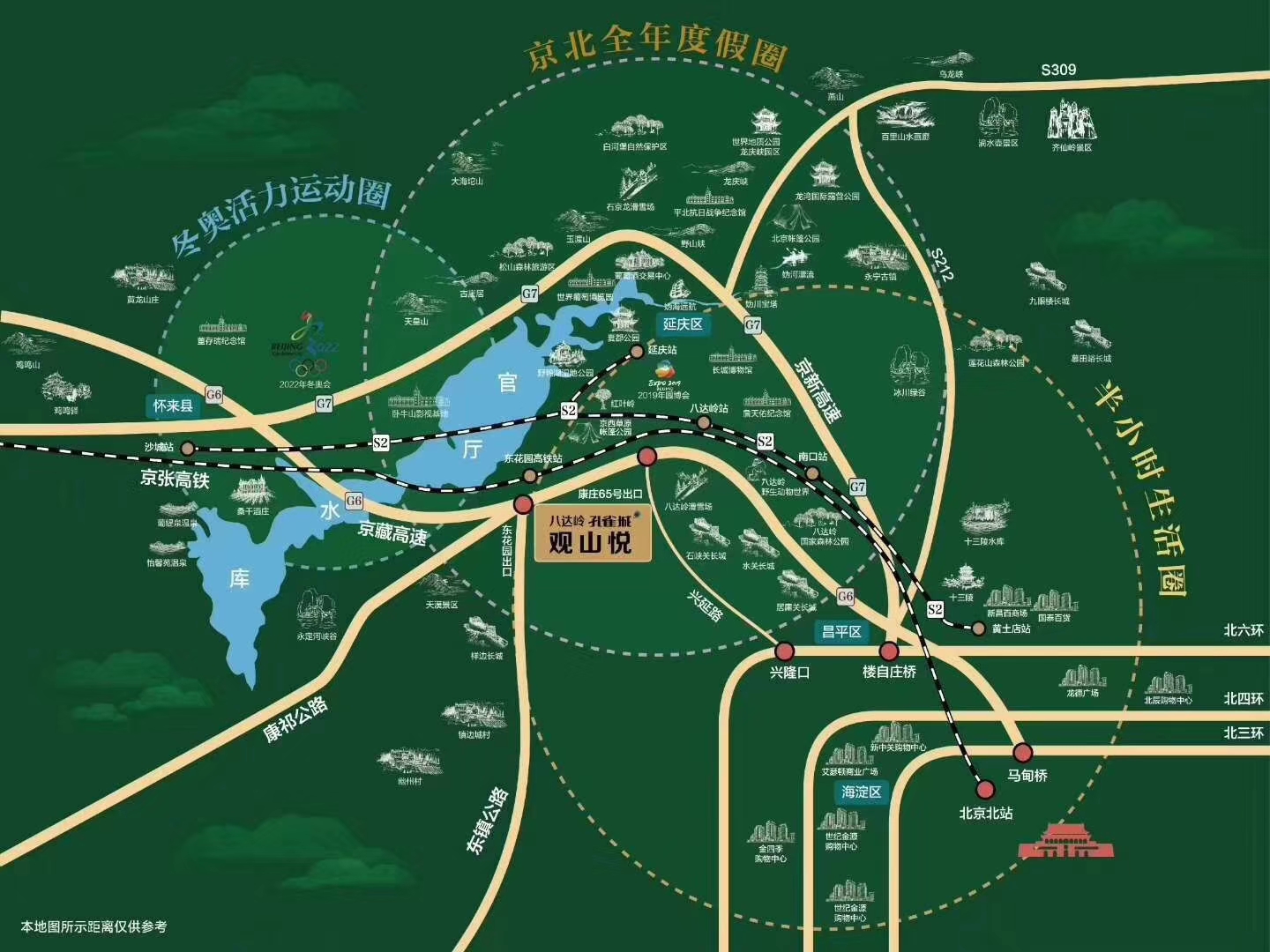 八达岭孔雀城位于京北生态新城的核心位置,对望八达岭,俯瞰官厅湖,毗邻北京延庆,地理位置优越。本项目位于八达岭孔雀城中心位置,距离京藏高速东花园出口南向约500米,怀来新兴产业示范区配套生活组团南部。北侧为岷江道,南侧为葡萄大道,东侧为天山南路,西侧为怀来新兴产业展馆。