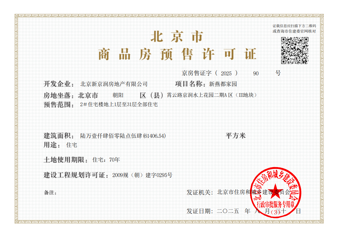 - 京房售证字(2025)90号 详情发证时间 2025-08-30绑定楼栋2#住宅楼地上1层至31层全部住宅证件照片
