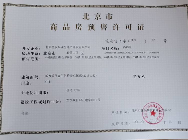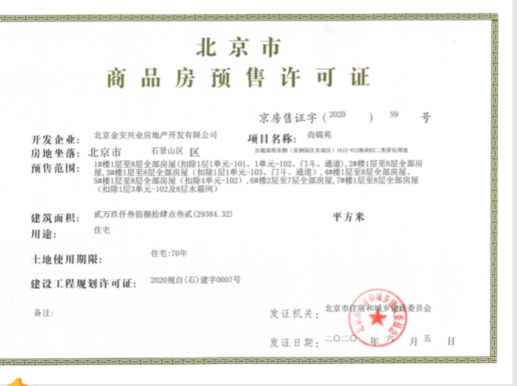 - 京房售证字(2020)57号 详情发证时间 2020-06-05绑定楼栋4#楼1层至8层全部房屋、5#楼1层至8层全部房屋、6#楼1层至8层全部房屋、7#楼1层至8层全部房屋
