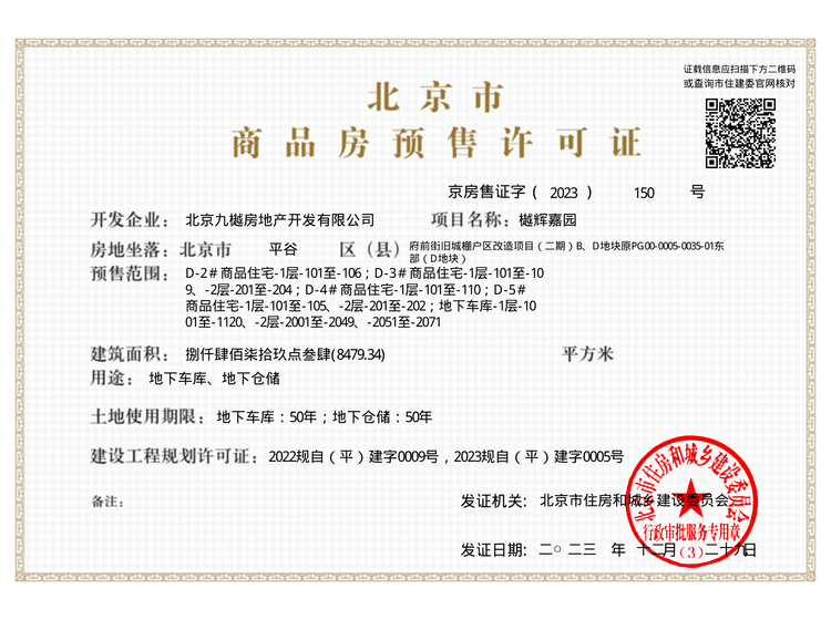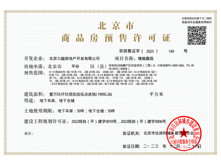 - 京房售证字(2022)156号 详情发证时间 2022-10-01绑定楼栋B-1#商品住宅2层至15层全部住宅;B-2#商品住宅1层至13层全部住宅;B-3#商品住宅1层至11层全部住宅;B-4#商品住宅1层至15层住宅(扣除:1单元4层401及4层402、2单元4层401及4层402);B-5#商品住宅1层至14层全部住宅;B-6#商品住宅1层至13层全部住宅;B-7#商品住宅1层至15层全部住宅;B-8#商品住宅1层至15层全部住宅证件照片