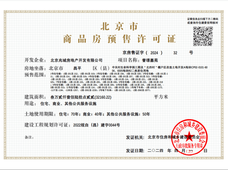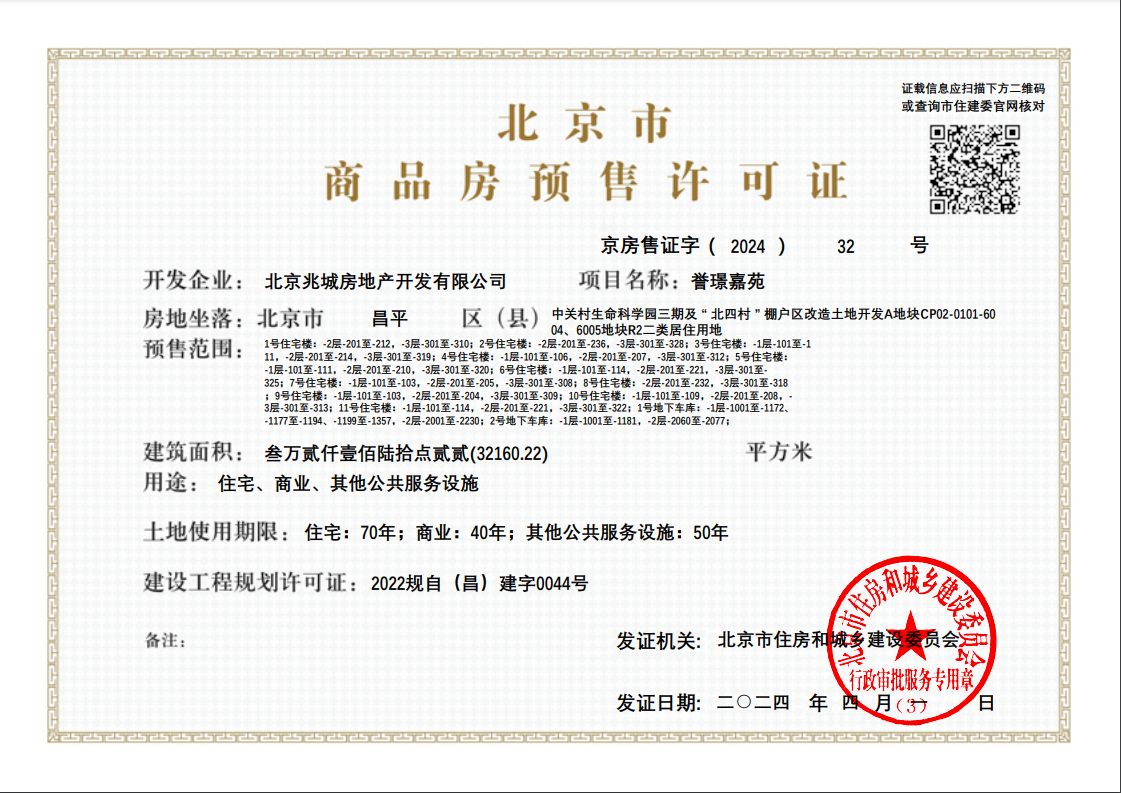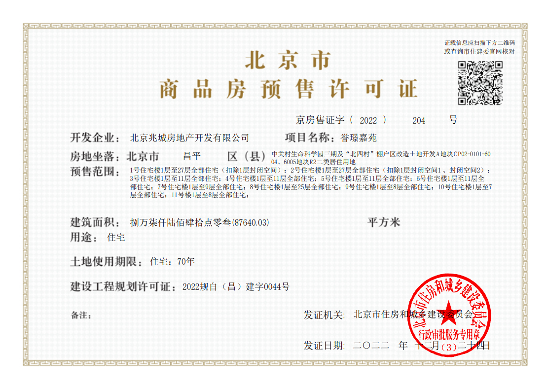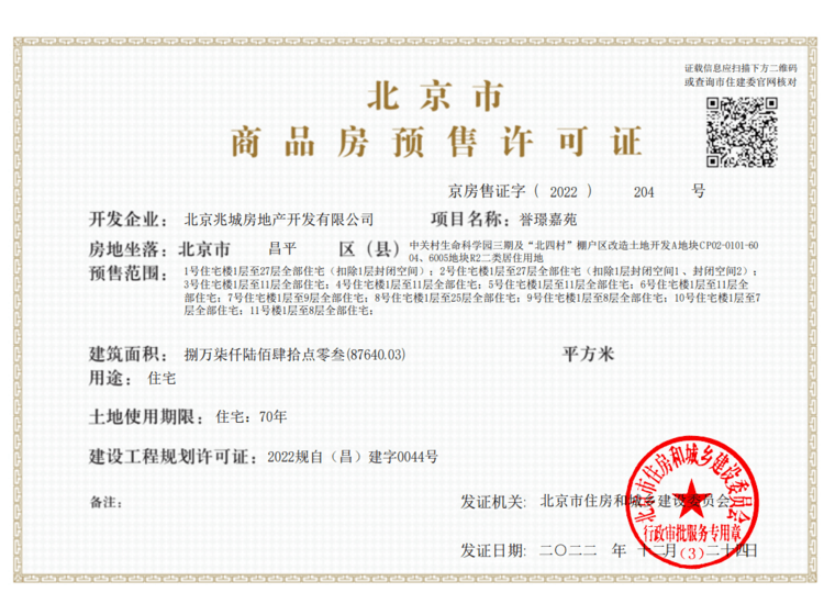 - 京房售证字(2022)204号 详情发证时间 2022-12-24绑定楼栋1号住宅楼1层至27层全部住宅(扣除1层封闭空间);2号住宅楼1层至27层全部住宅(扣除1层封闭空间1 、封闭空间2);3号住宅楼1层至11层全部住宅;4号住宅楼1层至11层全部住宅;5号住宅楼1层至11层全部住宅;6号住宅楼1层至11层全部住宅;7号住宅楼1层至9层全部住宅;8号住宅楼1层至25层全部住宅;9号住宅楼1层至8层全部住宅;10号住宅楼1层至7层全部住宅;11号楼1层至8层全部住宅;证件照片