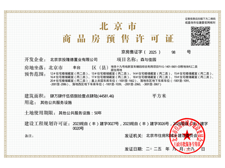 - 京房售证字(2025)98号 详情发证时间 2025-09-19绑定楼栋