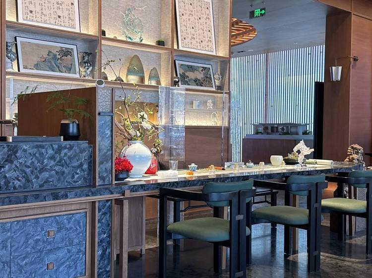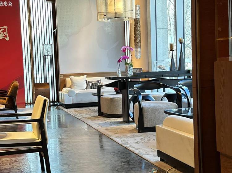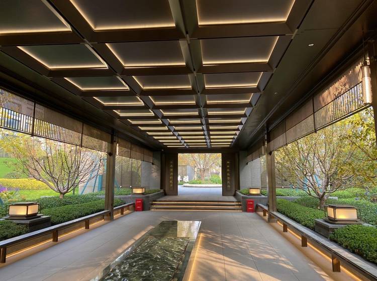 中式建筑讲究“图必有意,意必吉祥”,御道两侧分布十个柱体,底部的海棠格子花花纹,与侧面的海棠树和谐辉映;两侧的香槟金帷幔,定制宫灯,沉浸式体验盛唐皇家宫苑生活;御道中央水系极致精奢,运用3D打印和人工雕琢,可谓池水开朗,意蕴万千,点燃诗画雅境,承启国韵风华。如此大尺度的御道,在北京市场也是极其罕见的。