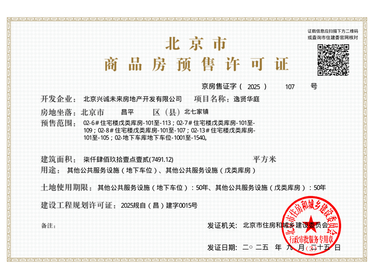 - 京房售证字(2025)107号 详情发证时间 2025-09-25绑定楼栋