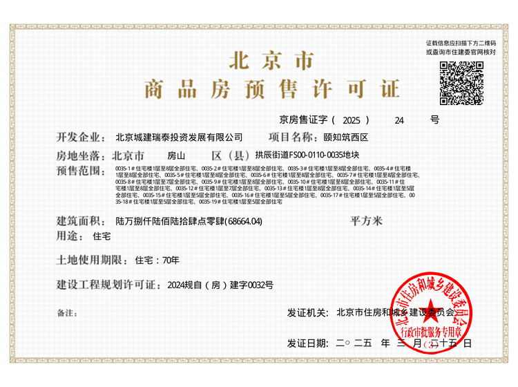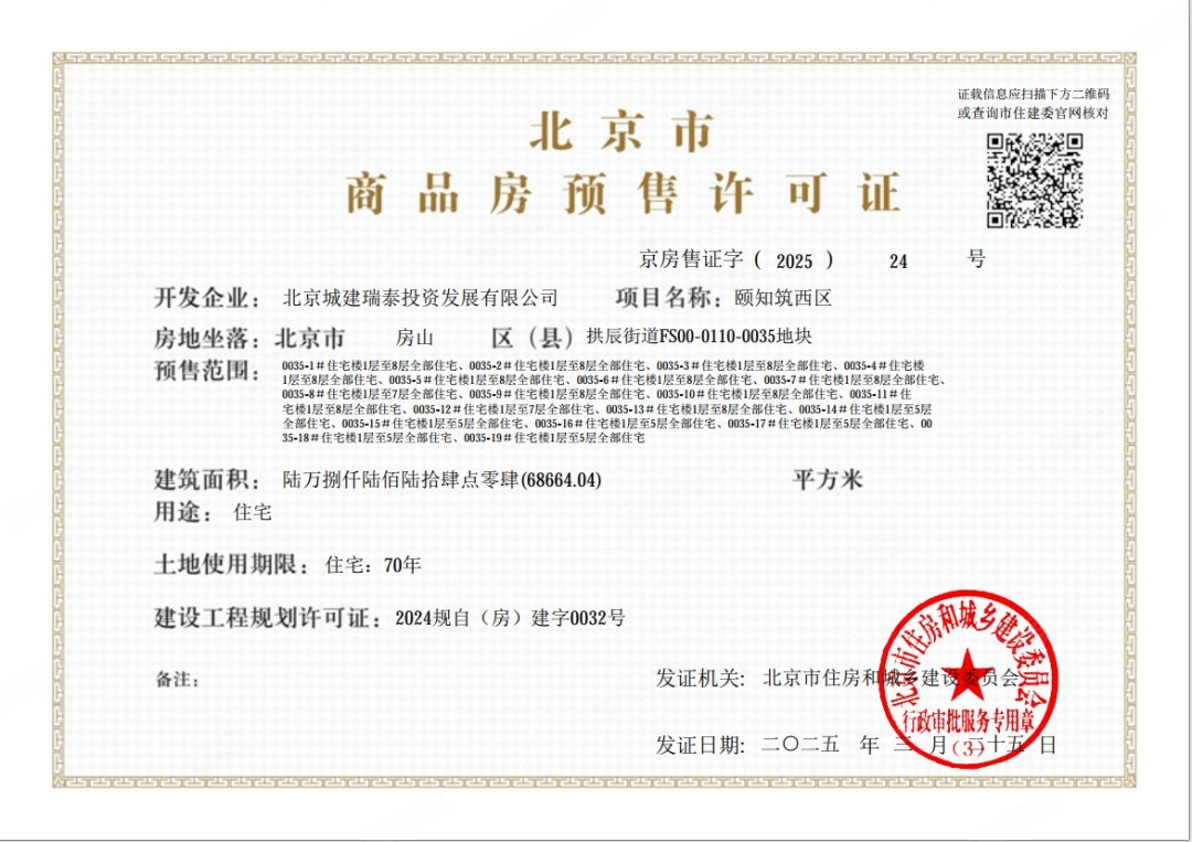 - 京房售证字(2025)24号 详情发证时间 2025-03-25绑定楼栋11#、2#、13#、10#、14#、1#、6#、9#、19#、5#、16#、7#、3#、15#、4#、17#、8#、18#、12#证件照片