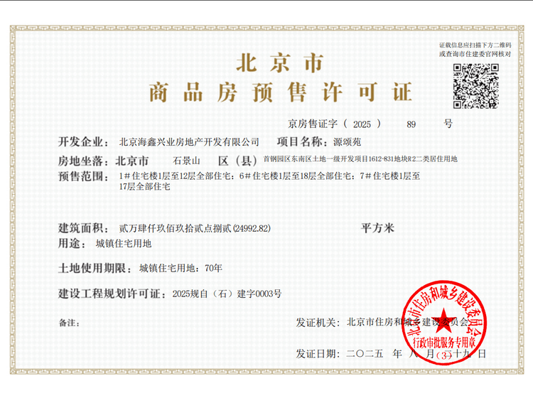 - 京房售证字(2025)89号 详情发证时间 2025-08-29绑定楼栋1#住宅楼1层至12层全部住宅;6#住宅楼1层至18层全部住宅;7#住宅楼1层至17层全部住宅证件照片