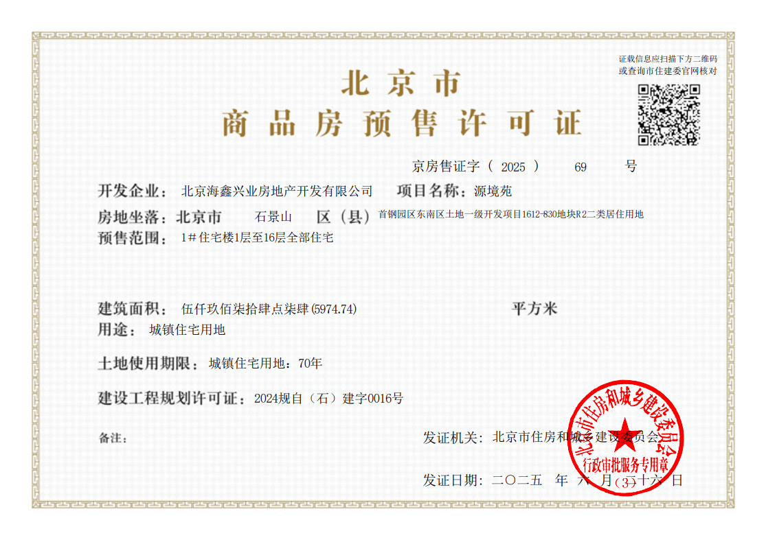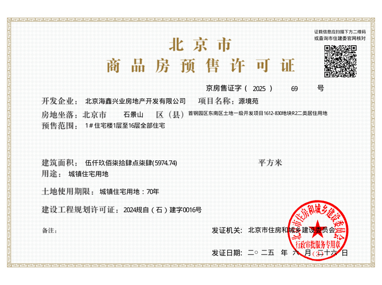 - 京房售证字(2025)69号 详情发证时间 2025-06-26绑定楼栋1#住宅楼1层至16层全部住宅证件照片