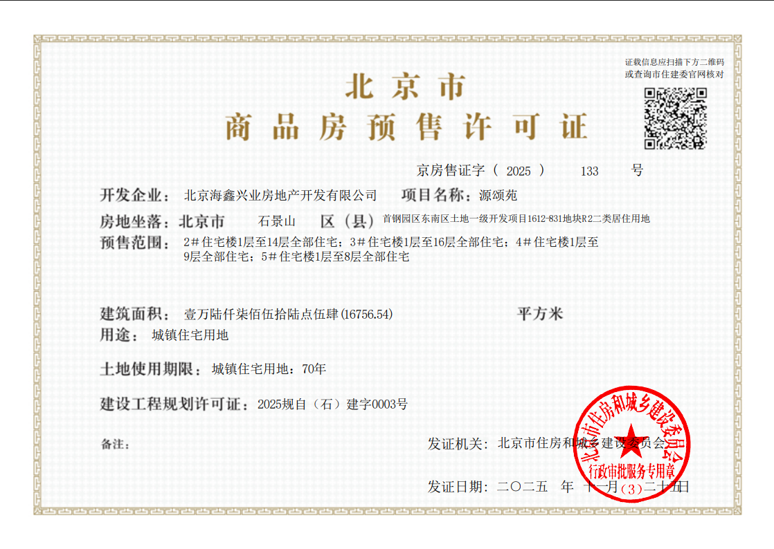 - 京房售证字(2025)133号 详情发证时间 2025-11-25绑定楼栋2#住宅楼1层至14层全部住宅;3#住宅楼1层至16层全部住宅;4#住宅楼1层至9层全部住宅;5#住宅楼1层至8层全部住宅证件照片