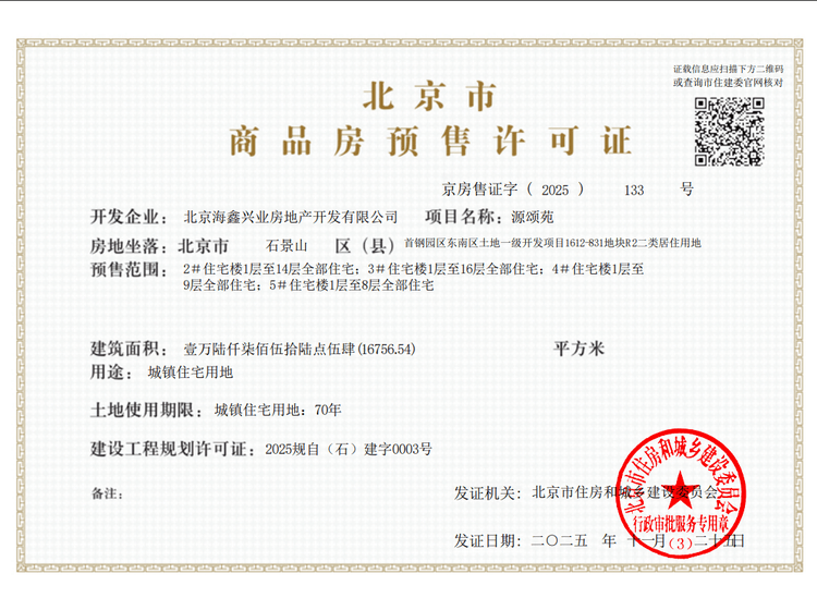 - 京房售证字(2025)133号 详情发证时间 2025-11-25绑定楼栋2#住宅楼1层至14层全部住宅;3#住宅楼1层至16层全部住宅;4#住宅楼1层至9层全部住宅;5#住宅楼1层至8层全部住宅证件照片