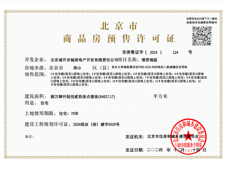 璟贤瑞庭是由北京建工城乡集团所开发的。“一条长安街 半部建工史”北京建工建设了以天安门、人民大会堂、国家博物馆等为代表的长安街两侧80%现代建筑群,参建鸟巢、水立方、大兴国际机场等一大批大国工程。项目择址西五环良乡大学城芯珍贵地脉,享全维度醇熟配套。项目规划约2.0容积率、约41-56米楼间距,7-15层,一梯两户低密洋房社区,设计以“一轴一环三园五境多组团”为规划,打造五重质享森居社区。臻筑建面约84-143㎡三至四居光幕宽境洋房,全面屏观景,主卧270°光幕飘窗、南向三面宽、独立家政间等空间设计亮点。璟贤瑞庭,以国匠匠心,敬启房山理想人居。