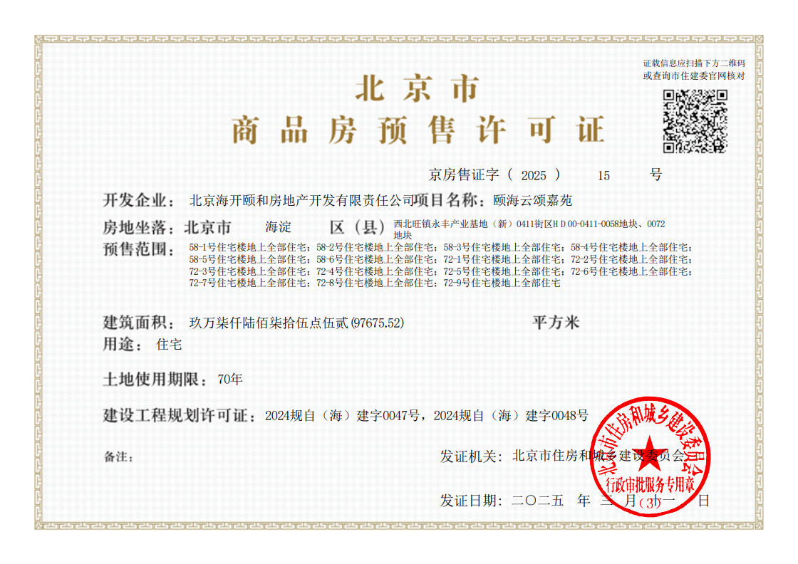 - 京房售证字(2025)15号 详情发证时间 2025-03-11绑定楼栋58-1号住宅楼地上全部住宅;58-2号住宅楼地上全部住宅;58-3号住宅楼地上全部住宅;58-4号住宅楼地上全部住宅;58-5号住宅楼地上全部住宅;58-6号住宅楼地上全部住宅;72-1号住宅楼地上全部住宅;72-2号住宅楼地上全部住宅;72-3号住宅楼地上全部住宅;72-4号住宅楼地上全部住宅;72-5号住宅楼地上全部住宅;72-6号住宅楼地上全部住宅;72-7号住宅楼地上全部住宅;72-8号住宅楼地上全部住宅;72-9号住宅楼地上全部住宅证件照片