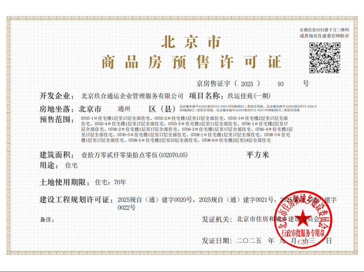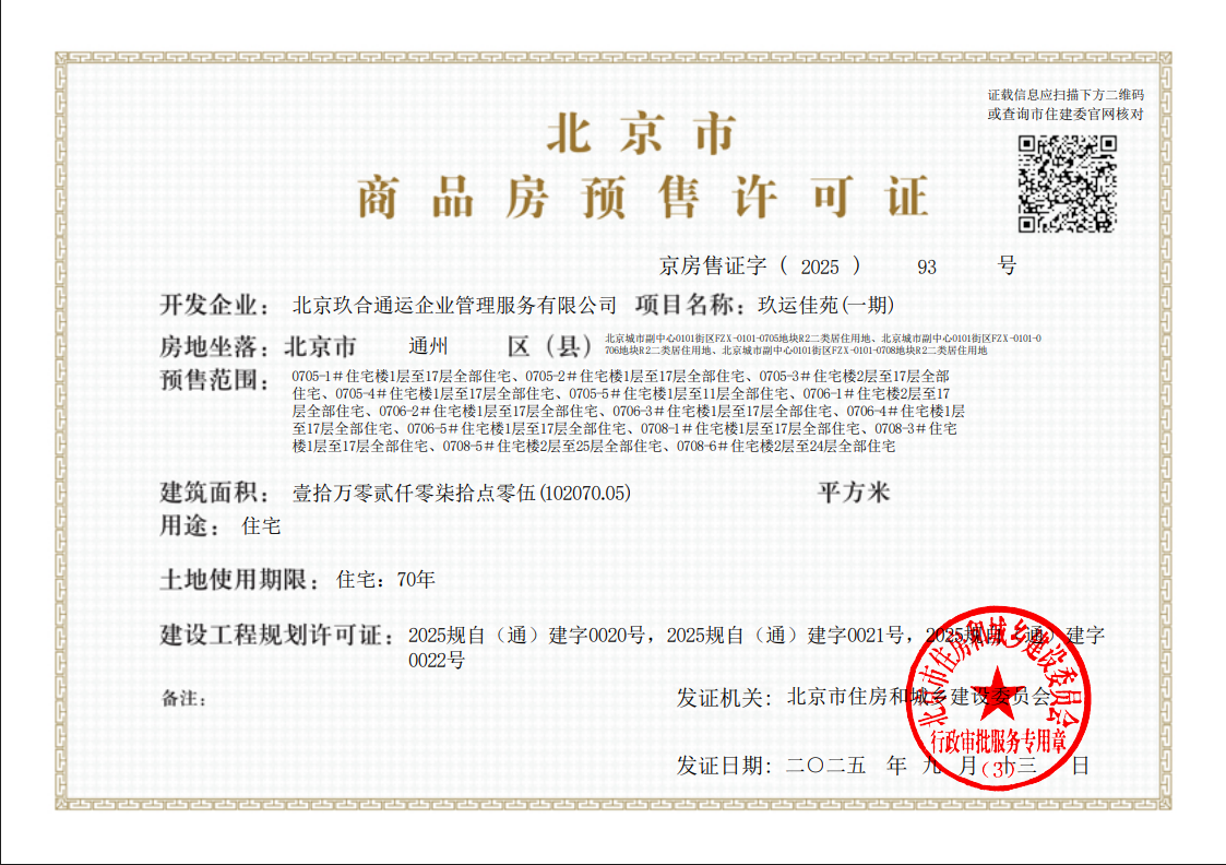- 京房售证字(2025)93号 详情发证时间 2025-09-13绑定楼栋0705-1#住宅楼1层至17层全部住宅、0705-2#住宅楼1层至17层全部住宅、0705-3#住宅楼2层至17层全部住宅、0705-4#住宅楼1层至17层全部住宅、0705-5#住宅楼1层至11层全部住宅、0706-1#住宅楼2层至17层全部住宅、0706-2#住宅楼1层至17层全部住宅、0706-3#住宅楼1层至17层全部住宅、0706-4#住宅楼1层至17层全部住宅、0706-5#住宅楼1层至17层全部住宅、0708-1#住宅楼1层至17层全部住宅、0708-3#住宅楼1层至17层全部住宅、0708-5#住宅楼2层至25层全部住宅、0708-6#住宅楼2层至24层全部住宅证件照片