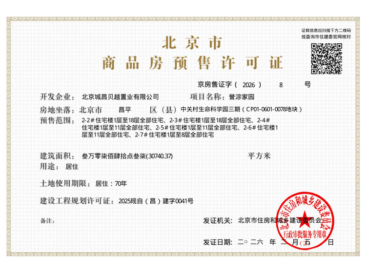 - 京房售证字(2026)8号 详情发证时间 2026-02-05绑定楼栋2-2#住宅楼1层至18层全部住宅、2-3#住宅楼1层至18层全部住宅、2-4#住宅楼1层至11层全部住宅、2-5#住宅楼1层至11层全部住宅、2-6#住宅楼1层至11层全部住宅、2-7#住宅楼1层至8层全部住宅