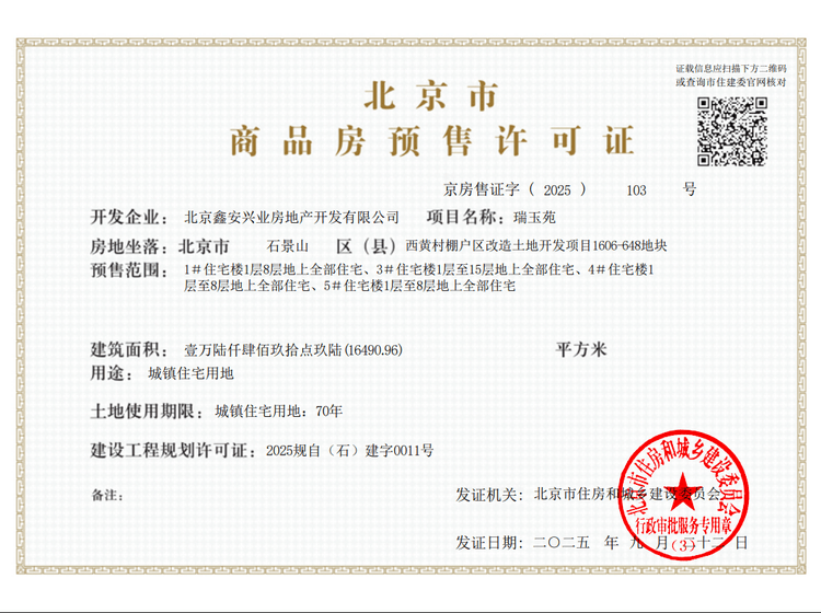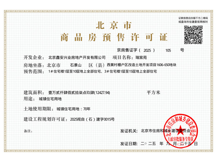 - 京房售证字(2025)105号 详情发证时间 2025-09-25绑定楼栋1#住宅楼1层至10层地上全部住宅、3#住宅楼1层至15层地上全部住宅