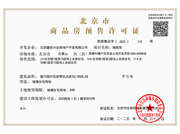 - 京房售证字(2025)119号 详情发证时间 2025-10-22绑定楼栋瑞宸苑11#、瑞宸苑10#、瑞宸苑2#