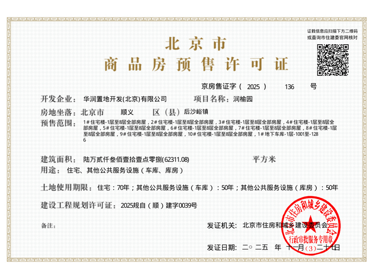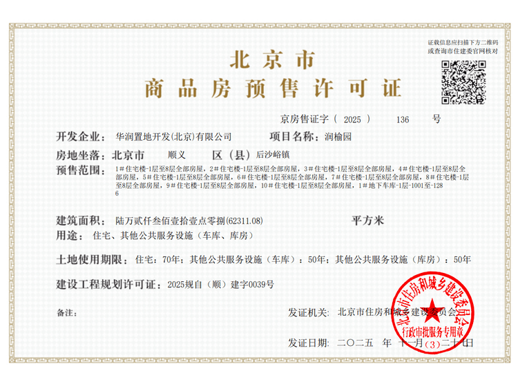- 京房售证字(2025)136号 详情发证时间 2025-11-27绑定楼栋1#住宅楼-1层至8层全部房屋,2#住宅楼-1层至8层全部房屋,3#住宅楼-1层至8层全部房屋,4#住宅楼-1层至8层全部房屋,5#住宅楼-1层至8层全部房屋,6#住宅楼-1层至8层全部房屋,7#住宅楼-1层至8层全部房屋,8#住宅楼-1层至8层全部房屋,9#住宅楼-1层至8层全部房屋,10#住宅楼-1层至8层全部房屋,1#地下车库-1层-1001至-1286证件照片