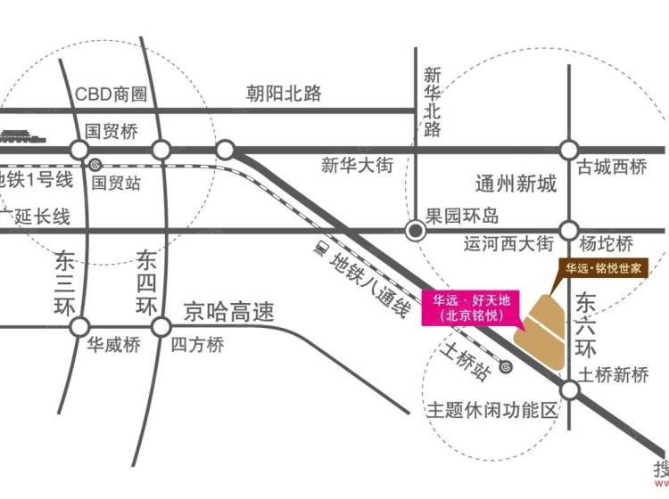 华远·铭悦好天地位于八通线地铁土桥站旁,是华远地产在通州取得的12万平米住宅商业金融综合用地。其金融商业用地占地约8万平米。