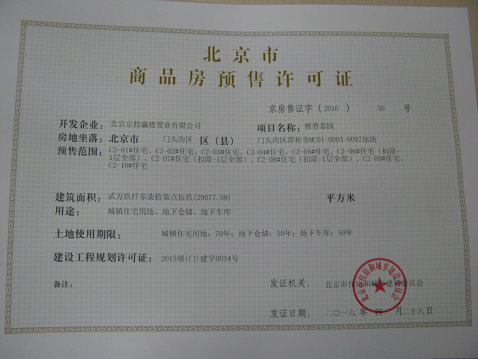 - 京房售证字(2016)50号 详情发证时间 2016-04-28绑定楼栋C2-01#住宅、C2-02#住宅、C2-03#住宅、C2-04#住宅、C2-05#住宅、C2-06#住宅(扣除-1层全部)、C2-07#住宅(扣除-1层全部)、C2-08#住宅(扣除-1层全部)、C2-09#住宅、C2-10#住宅证件照片