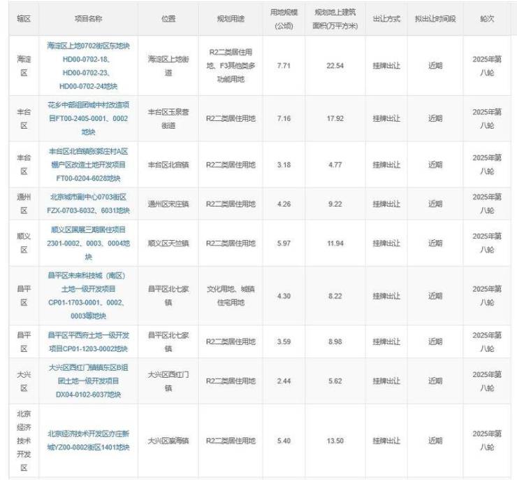 2025年北京第八轮拟供应商品住宅用地清单
