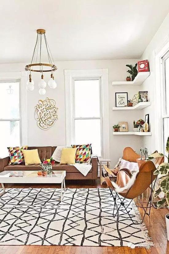 民族风条纹配木色家具和灰色沙发肯定不会出错。注意家具的细节,仿旧的款式和地毯更配哦。