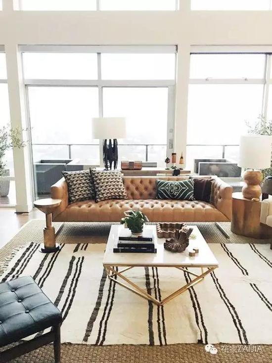 亚麻色打底,上面铺小块花纹地毯或单块动物皮革,季节变化的时候随时换。