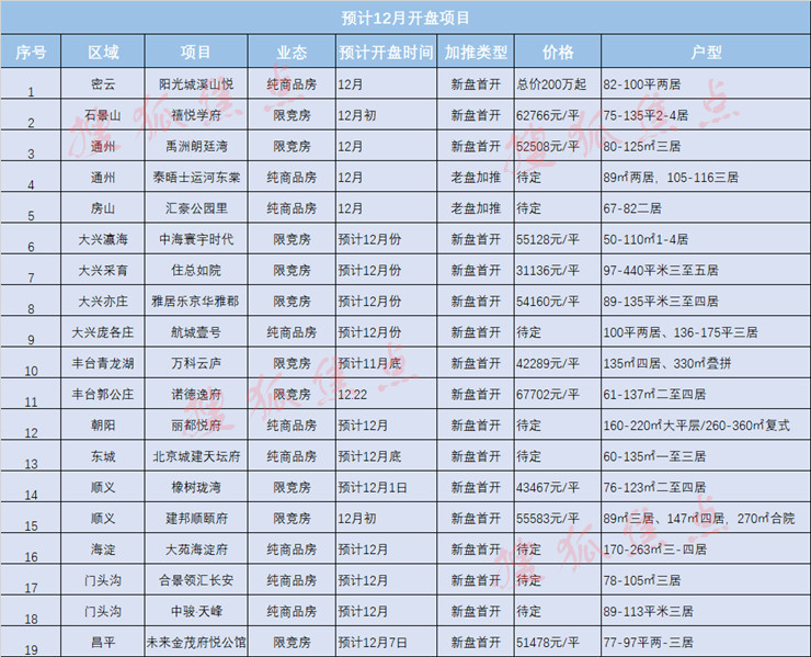 “年底”这个词对于中国老百姓代表的意义很多,其中的一层含义就是促销!如各大商场、4S店、餐饮等都会推出优惠活动来去化堆积的产品,进而达到一年的业绩目标!对于大宗商品的房子来说也不例外,房企在这个时候会加速回笼资金节奏,或推出抢眼的新房项目,推出特价优惠等方式来吸引购房者。据搜狐焦点统计,预计12月份会有约19个项目入市,如果按每个项目500套房源粗略估算,会有近1万套的房源注入市场,这其中有大兴的中海寰宇时代、石景山的禧悦学府、昌平的未来金茂府悦公馆等热门楼盘,其实这对于购房者来说是件好事,选择的机会增多了,您可以耐心的挑选和对比,最终买一个自己心仪的房源!咨询购房专家买房问题请添加小助理微信号:goufang02 有问必答