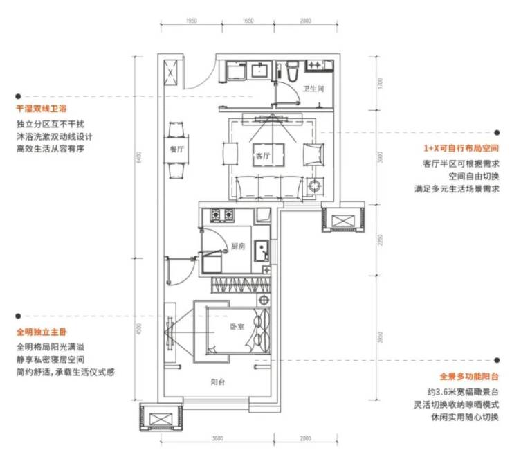 - 65㎡的“1+X可变空间”,客餐厅面宽做到了5.6米,在同面积段里很少见。