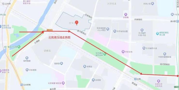 南侧的一排楼正对着奥运会时期留下来的高压线,9号楼面前正对着一个高压塔,12号楼左前方斜对着一个高压塔,13号楼正前方有两个高压塔。