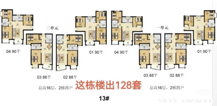 12号楼总高16层,有24套房源,小户型居多;13号楼有128套,总高16层,90平的南北小三居居多,还有88平的南向两居。