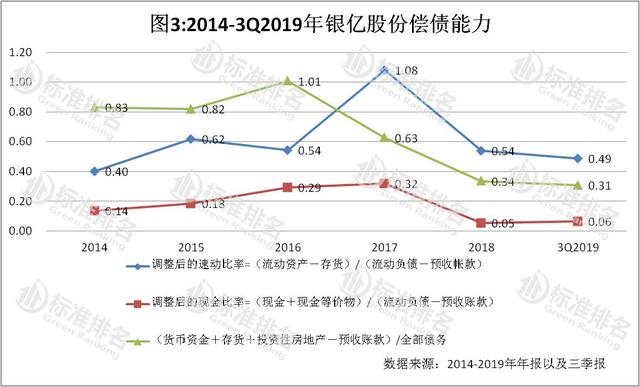 由于流动性遭遇危机,营业收入出现下滑,ST银亿的偿债能力均欠佳。从偿债能力方面来看,自2018年开始ST银亿的偿债能力直线下降。调整后的速动比率由2017年底的1.08,到2018年腰斩一半,下降至0.54。今年三季度持续下降至0.49,显示了ST银亿的短期偿债压力。