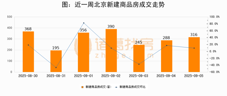 根据北京市住房和城乡建设委员会数据显示,2025年09月05日北京新建商品房成交316套,较昨日增加28套,环比上涨9.7%。近一周北京新建商品房日均成交309套。09月05日单日成交316套,高于近一周平均水平2.3%。