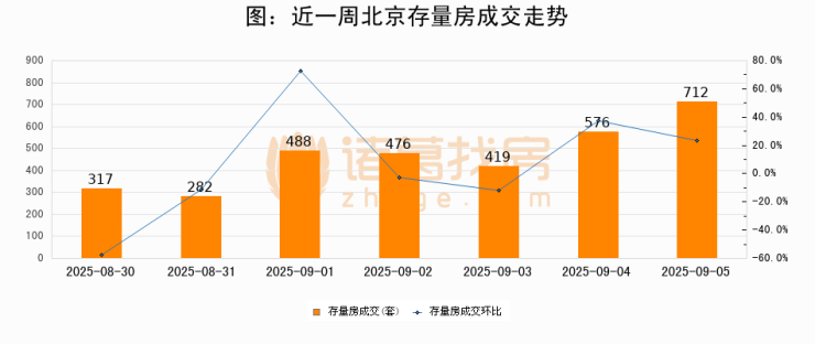 从存量房来看,2025年09月05日北京存量房单日成交712套,比昨日增加136套,环比上涨23.6%。从近一周存量房成交来看,北京存量房日均成交套数为467套,09月05日单日成交712套,高于近一周平均水平52.5%。