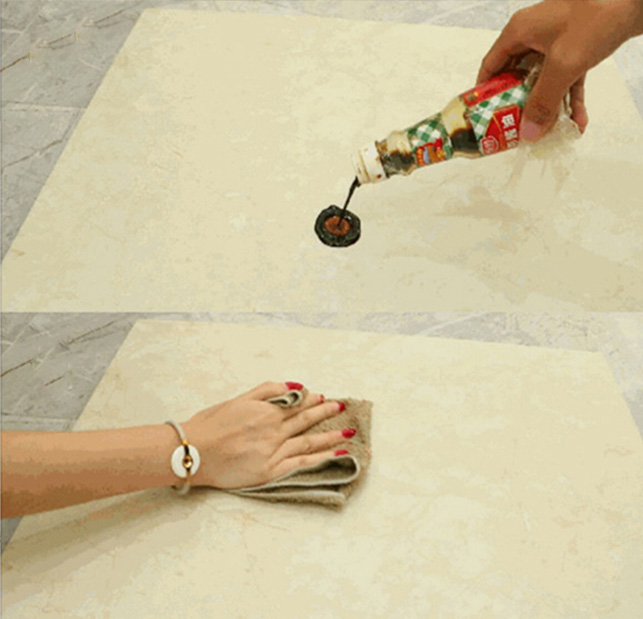 止滑砖是一款优质的防滑地砖,耐污染性达到4级以上。可选择将酱油倒在砖面上进行测试,再用湿毛巾进行擦拭,可以清楚地看到倒在瓷砖上的酱油很轻松地便可被清除,只擦一遍即可将其清理干净,砖面亮洁如新,完全没有污渍残留,可见抗污清洁效果不一般。
