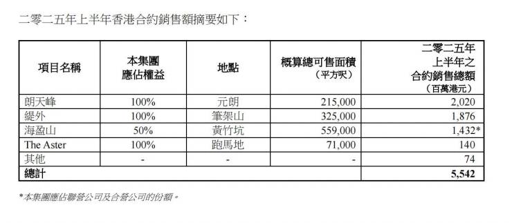 上半年,香港物业部合约销售总额为55.42亿港元,主要来自多个项目的贡献。如元朗天峰新推售,录得合约销售额20.2亿港元;高端项目缇外持续销售,贡献18.76亿港元,但销售速度较去年同期放缓(因去年取消楼市降温措施释放了被压抑的需求);以及黄竹坑港铁站项目海盈山录得应占合约销售额14.32亿港元等。