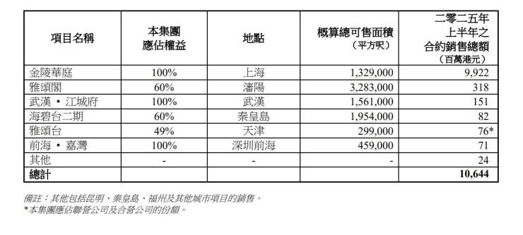内地物业部录得应占合约销售额106.44亿港元,较2024年上半年的12.04亿港元大幅增长,主要受上海金陵华庭第一期预售带动,但其他二、三线城市项目销售势头依然缓慢。