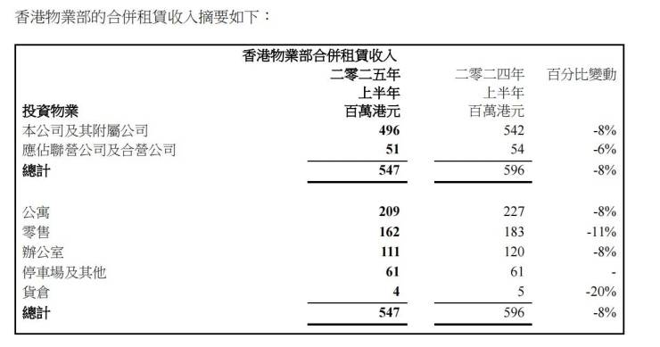数据显示,2025年上半年,上述投资物业组合录得合并租赁收入5.47亿港元(2024年同期为5.96亿港元),合并业绩4.19亿港元(2024 年同期为 4.61 亿港元),毛利率维持77%不变。