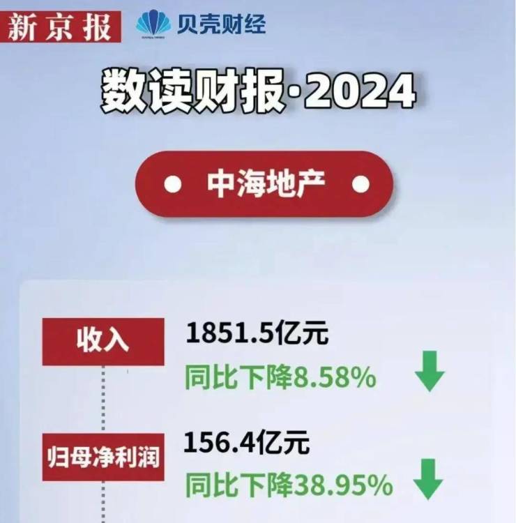 中海地产2024年营业收入1852亿元,同比减少8.58%;归母净利润156.4亿元,同比暴跌38.95%,与五年前(2020年)相比缩水超六成。
