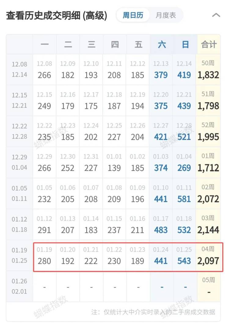 成交量:上周(1月19日-1月25日),北京大中介二手房实时成交 2097套,