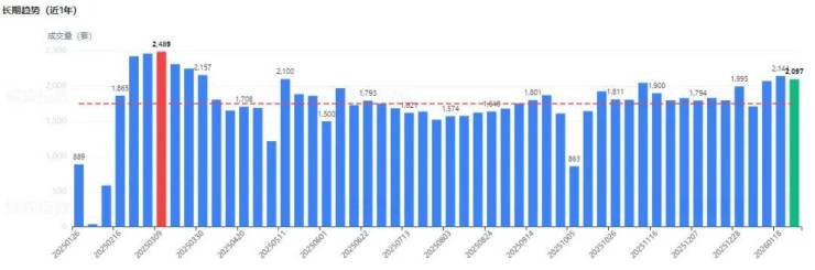 最近一年,周成交量平均值为1751套,最高值为2489套。