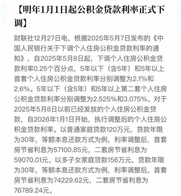 从2026年1月1日起,全国范围内的存量住房公积金贷款利率将统一下调。