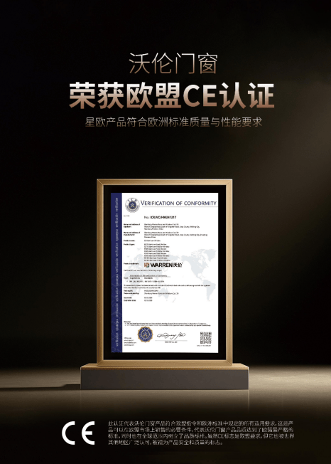 在此次产品更新升级之前,沃伦就已经获得了美国建筑制造商协会AAMA、美国国家门窗评级委员会NFRC、北美门窗制造协会NAFS、全球质量保证机构intertek、美国国家认证与管理学院NAMI等多项产品认证,其中NFRC的认证就是要将门窗产品的能量量化。除此之外,星欧系列新品已获得「欧盟CE认证」,这一趋势也证实了沃伦的产品已达到较高出口水准!