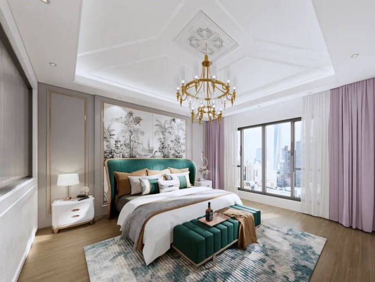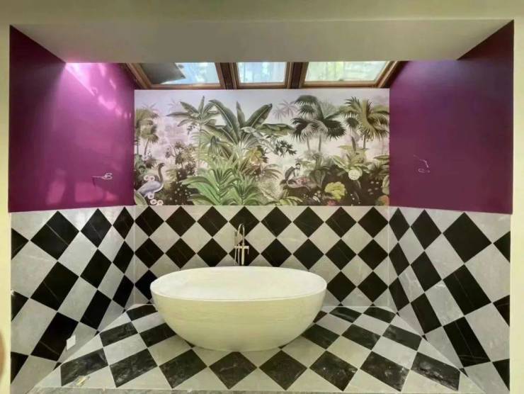 主卧,高贵的紫色配上圆形浴缸整体充斥着优雅高贵的浪漫气息,绿色的床和墙面让空间自然舒适。