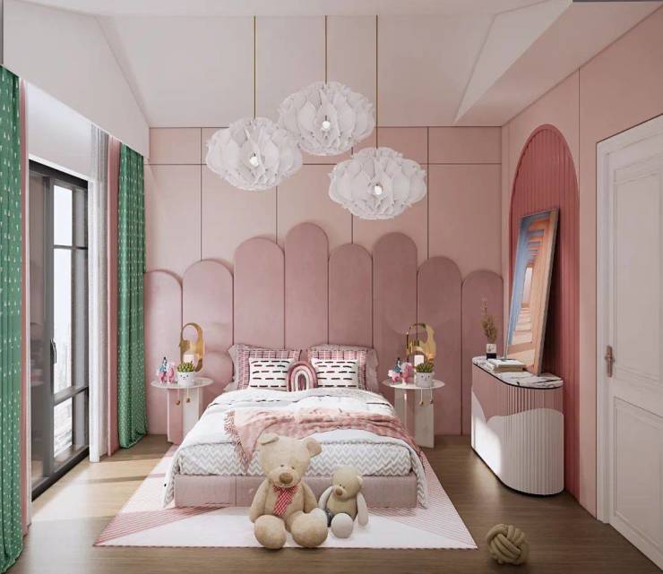 儿童房用灰粉色,高低不一的圆弧形背景墙让空间丰富柔和。